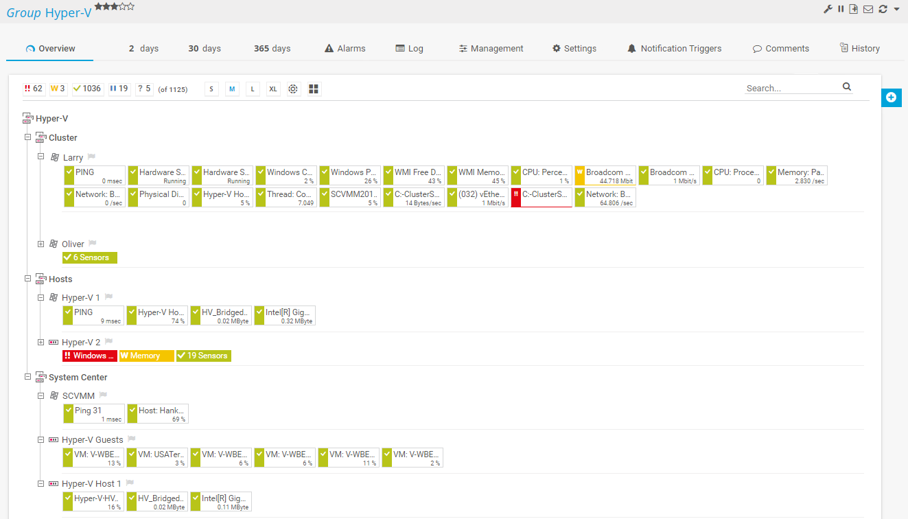 This screenshot shows an example of a Hyper-V group. There is a dedicated group for failover clusters where two cluster nodes are monitored with several SNMP and WMI sensors, as well as Hyper-V Host Server sensors and sensors for the Hyper-V virtual machines. This makes sure that Hyper-V and failover clusters work without any issues. The Hyper-V hosts are monitored the same way, organized in a dedicated group for hosts.