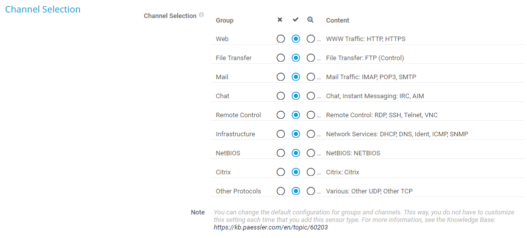 • No (i_channel_selection_no): Do not account traffic of this group in its own channel. The sensor accounts all traffic of this group to the default channel named Other.
