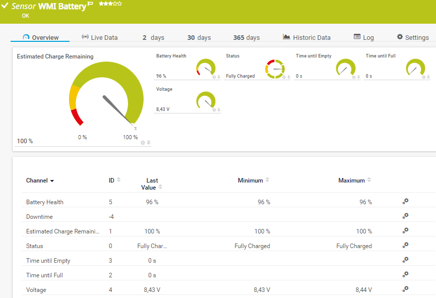The WMI Battery sensor monitors the available capacity and the state of connected batteries or uninterruptible power supplies (UPSs) of a Windows-based device via Windows Management Instrumentation (WMI).